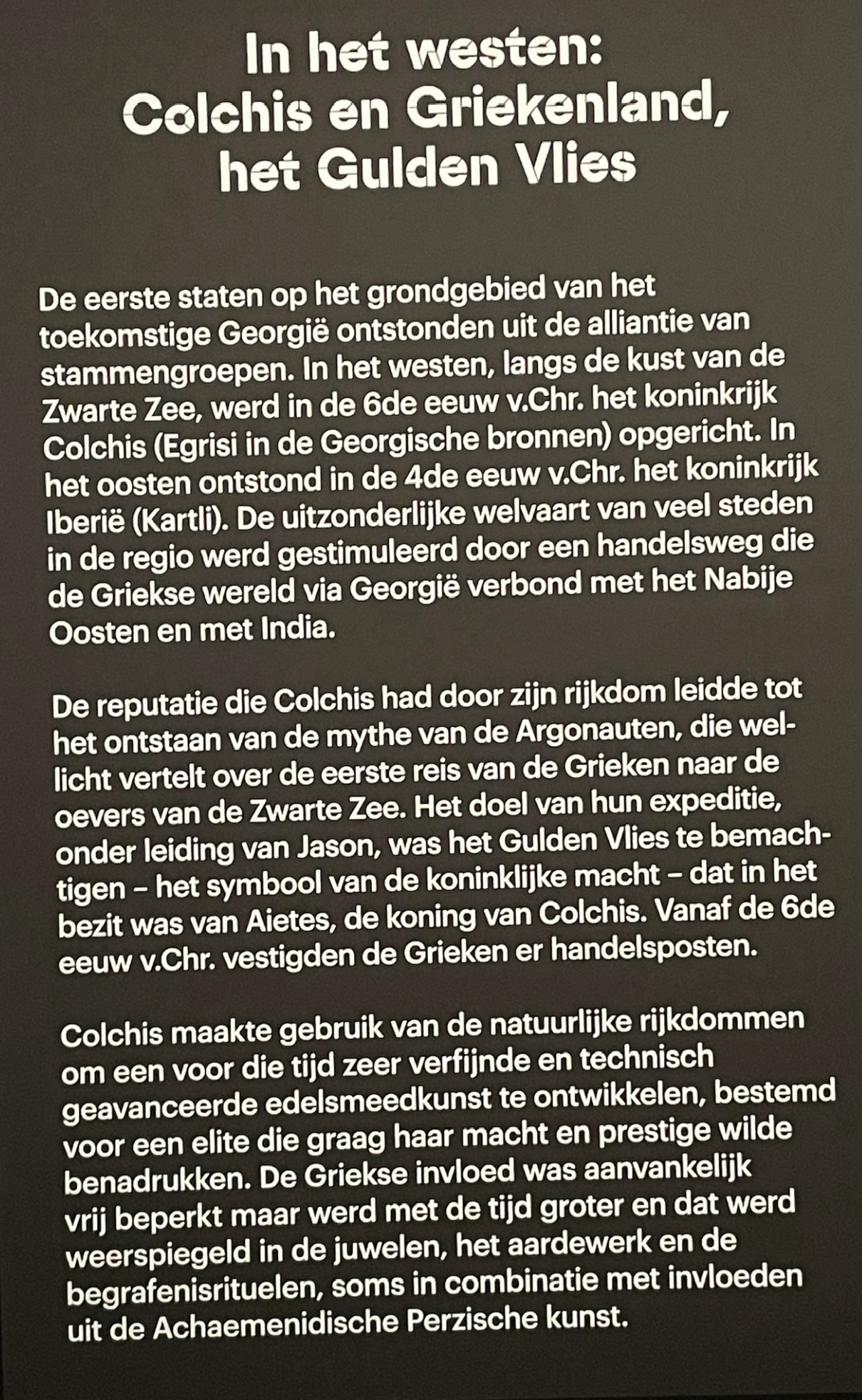 De tentoonstelling legt ook een verrassende link met onze contreien. In 1430 stichtte de Boergondische hertog Filips de Goede (1396-1467) een nieuwe ridderorde waarmee hij alle vooraanstaande edelen uit het Boergondisch rijk rond zich verzamelde. Voor de naam van dit nobele gezelschap – de Orde van het Gulden Vlies- liet de hertog zich inspireren door de Griekse mythe van de Argonauten. Die trokken in een ver verleden naar het legendarische Colchis, aan de oostkust van de Zwarte Zee in het huidige Georgië. Daar moesten ze de gulden vacht of vlies van een wonderbaarlijke, vliegende ram zien te pakken krijgen.