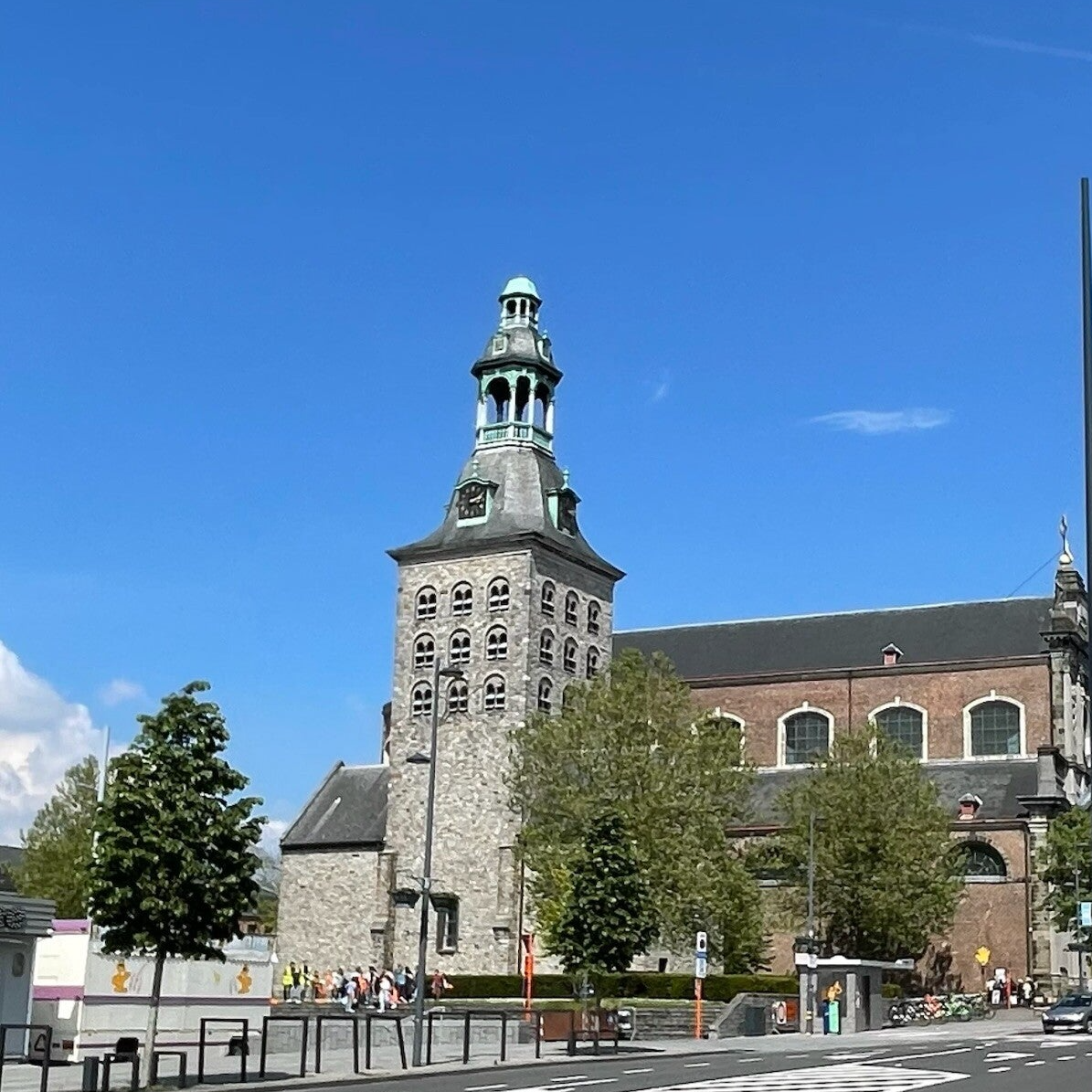 Aan de westzijde, voormalige romaanse vieringtoren onder leien torenspits met torenuurwerk, lantaarn en ijzeren kruisbekroning met windhaan. Vierkante toren uit Doornikse steen met aan elke zijde negen galmgaten in omvattende rondboognis. Rondboogpoort in bak- en natuursteen geplaatst voor de vieringtoren aan de kant van het Marktplein.